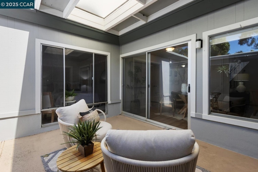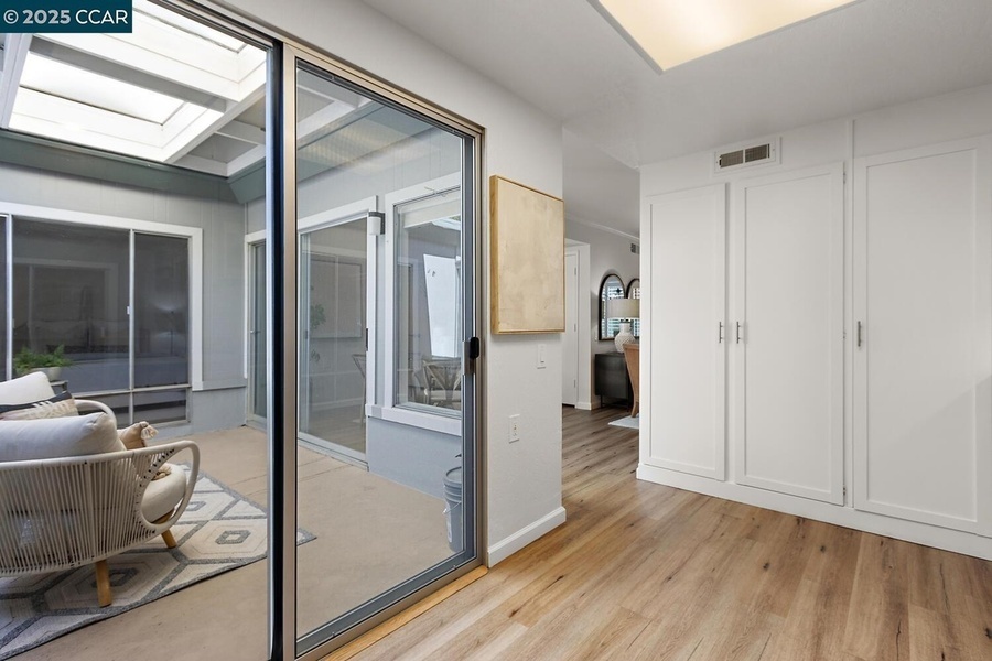 This beautiful level-in home has been reduced $50,000 on 8/23/25. Light and bright throughout, the home features an open concept layout, private atrium, and peaceful greenbelt/garden views. Stylish luxury plank flooring, smooth ceilings (no popcorn), gorgeous plantation shutters, and designer finishes throughout. The kitchen features modern cabinetry, sleek countertops, a built-in microwave, and quality updates. The LG washer/dyer all-in-one adds convenience. NO STAIRS, NO UPSTAIRS NEIGHBORS - just peaceful living in a premier location close to amenities. Location, Location, Location truly sets this level-in home apart from all the rest. The HOA maintains the landscaping, exterior, roof, and hot water heater. The hot water heater was just replaced by the mutual this year.