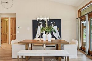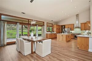 Modern single-level stucco home set on 23.57 acres with oak trees and meadow views. The open floor plan features high ceilings and heated vinyl plank flooring throughout. The newly renovated chef’s kitchen includes a European-style hood, large island with seating, wet sink, wireless charging, and bar counter with pendant lighting. The dining area offers custom lighting and slider door access to the private backyard.