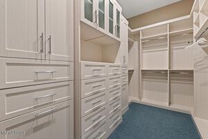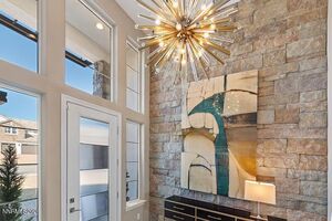 Two expansive cascading window walls bring the outside in, enhancing indoor/outdoor living. The impressive primary suite is complete with an elegant fireplace, custom designed walk-in primary closet and well-designed primary bath and provides a welcome retreat. Luxury features highlighting the primary bedroom include a custom wood and marble surround fireplace, custom closet with extensive built-ins, and a generous bathroom with large shower, designer tile and wood framed mirrors. Guest rooms are conveniently located off the main entry with one ensuite and a full additional bath. Seven custom chandeliers accent various areas throughout the home. Home has a ring doorbell, security system and Hunter-Douglas window coverings. The large laundry room features a sink, extensive cabinets, drop zone and large counter. The large 3 car garage features epoxy flooring.