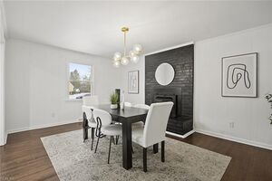 Bold fireplace sets this dining room/den