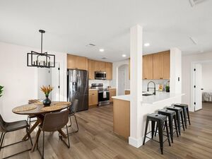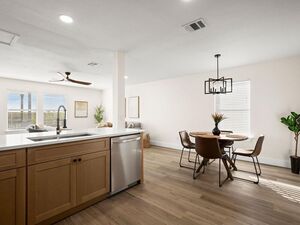Beautifully updated 2-story home featuring modern light-wood kitchen and bath cabinets, wood-laminate flooring throughout, and fresh interior paint, baseboards, and doors. Major improvements include a new foundation, roof, and water heater. Primary bedroom conveniently located on the main level. Home offers 5 bedrooms, 2.5 baths, 2 dining rooms, and 3 living rooms-including an upstairs living space perfect for a game room or media room. Updated bathrooms with new vanities, mirrors, and lighting. Set on an oversized cul-de-sac lot that backs to a greenbelt for added privacy. Move-in ready with modern finishes throughout.