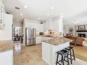 Owner’s suite features a spa-like ensuite bathroom. The bathroom includes separate sink vanities, quartz countertops and large separate shower plus walk-in closet. An oversized game room complete with a kitchenette and half bath, offers views of the outdoor space. Full size utility room. Endless amount of closet space. Enjoy outdoor tranquility with two outdoor living spaces; covered patio and open courtyard with beautiful blooming landscape in the growing seasons. A 28’ x 22’ detached extended two car garage. Sprinkler System.