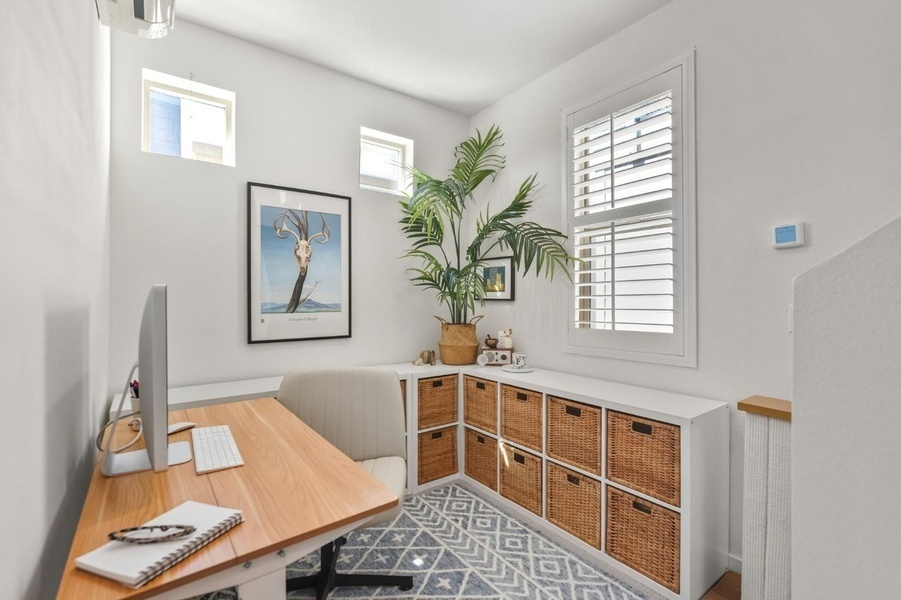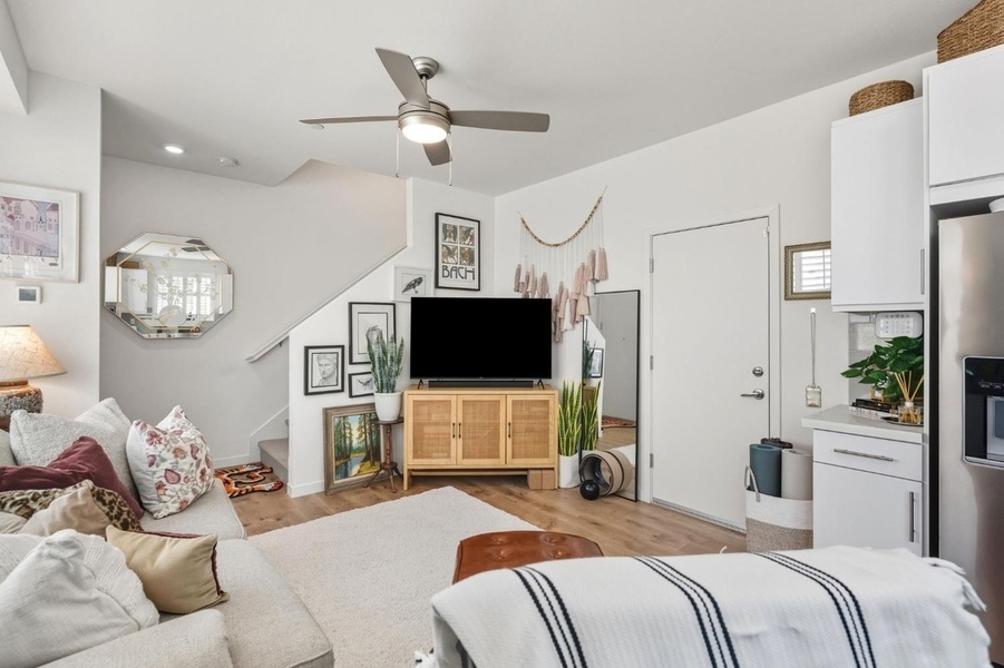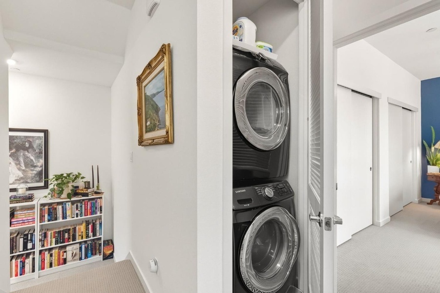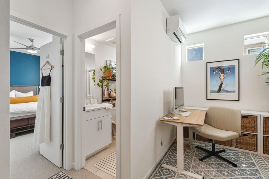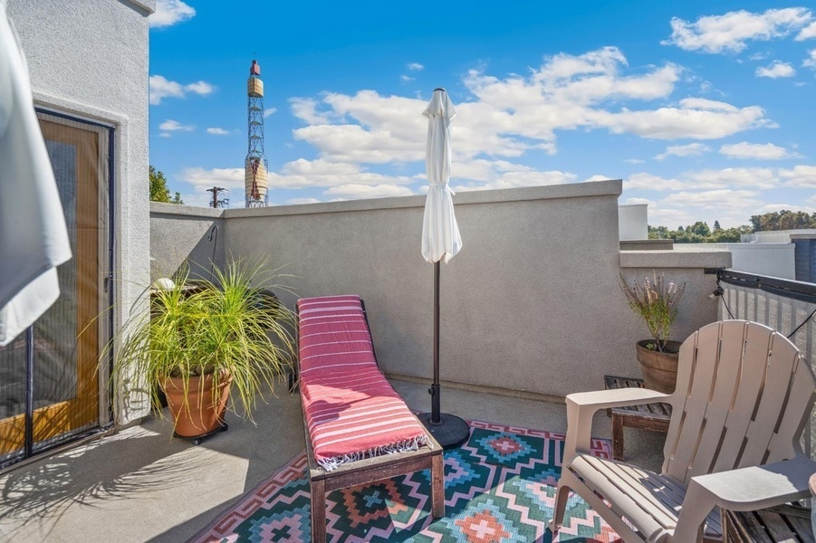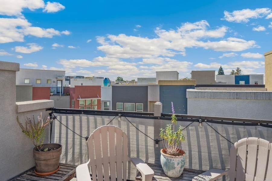 Discover this fabulous, light-filled 3-story condo in the heart of The Mill- a true urban retreat blending style, comfort, & convenience! This 1 bed/1 bath, 801 sq ft home offers an airy layout w/ sleek stainless steel appliances, chic hooded gas range, & modern finishes that elevate the kitchen. The second level features a versatile office or flex space, perfect for working from home, creative pursuits, or a cozy lounge area. The spacious primary suite includes two large closets & the convenience of an upstairs laundry closet just steps away. At the top, enjoy your own private rooftop deck, an ideal spot to unwind and take in stunning sunset views.
