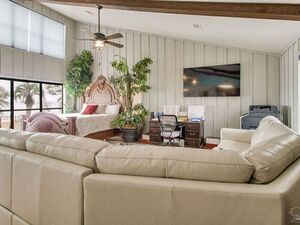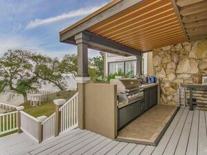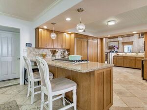 The gourmet kitchen is equipped with top-tier appliances, a Sub-Zero refrigerator, oak cabinetry, and granite countertops, providing ample space for culinary endeavors. The inviting living room boasts vaulted ceilings, travertine floors, a natural fieldstone fireplace, plantation shutters, and a wet bar-all complemented by sweeping bay views and French doors leading to the waterfront deck and outdoor kitchen.