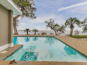This extraordinary 2.09-acre waterfront estate is situated on Perdido Bay with 300 feet of pristine, accessible shoreline and panoramic water views. The gated estate features multiple structures, including the main house, pool house, 3-car garage, garden shed, and gazebo. The main residence spans three levels, offering 5,559 square feet of luxurious living space, including 5 spacious bedrooms, 5.5 bathrooms, and an executive office.