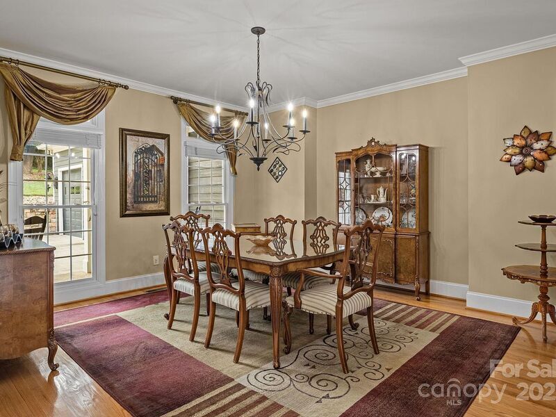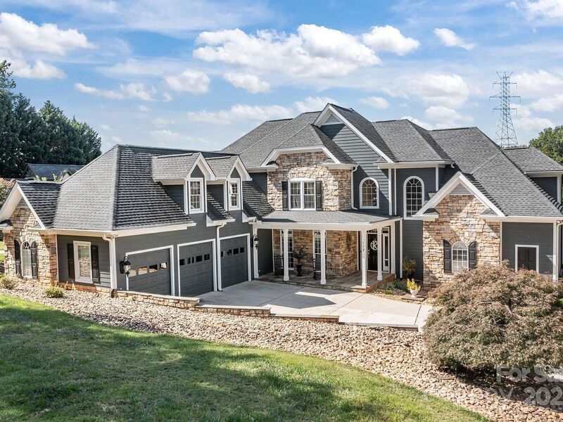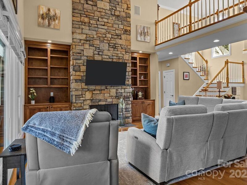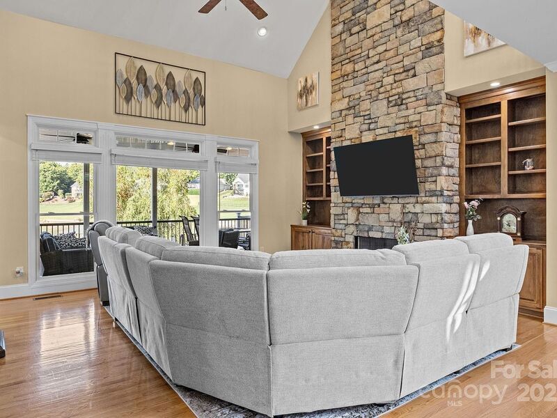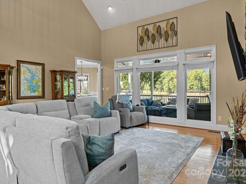 The spacious main level primary suite features a sitting area, cathedral ceiling and dual walk in closets. The primary bath has dual vanities, a jetted tub, large custom shower and tile floors. Recessed lighting throughout the home. The family room has a two-story ceiling and a gas log stone fireplace. Enjoy a great view of Lake Norman from most rooms.
