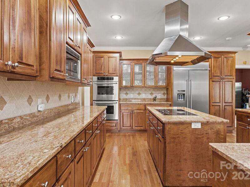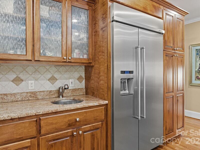 The kitchen features granite countertops and built-in kitchen appliances. The kitchen island has an electric cooktop with a Thermador exhaust fan. Two wet bar areas are adjacent to the kitchen. The keeping room also has a gas log stone fireplace. The laundry room has a mudroom sink with cabinets and tile floors. Washer and Dryer to remain.