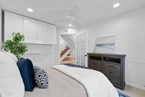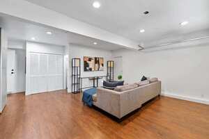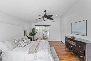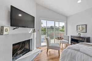 Interior highlights include a remodeled kitchen with white shaker cabinetry, quartz countertops, stainless-steel appliances, hard-surface flooring, recessed LED lighting, and a cozy wood-burning fireplace. A flexible first-floor bedroom is ideal for guests, in-laws, or a home office.