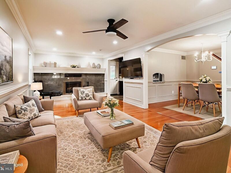 Stepping through the front door, you’ll immediately appreciate the openness of the main level. The oversized family room is filled with natural light, highlighting the stunning trim work & wainscoting throughout. A wood-burning fireplace with a gorgeous mantle creates a cozy atmosphere, perfect for enjoying this time of year. Just off the family room is a large updated half bathroom. Overlooking the front yard, on the opposite side of the stairwell, is the dining room. A large pass-through provides easy access to the kitchen, making it ideal for hosting. The oversized entryway leads into the living room, a spacious bonus area featuring a second fireplace with a grand mantle.