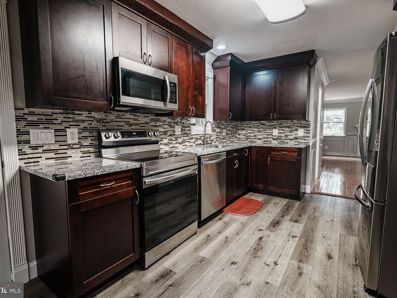 Just off the living room, you’ll find the absolutely stunning kitchen, which offers plenty of cabinet & counter space! Cherry cabinets are complemented by a modern backsplash, upgraded countertops, stainless appliances, and luxury vinyl flooring leave little to be desired in this space. An amazing sunroom with main floor laundry is filled with natural light and overlooks the rear yard as you head out to the deck. The huge wood deck spans the back of the home, offering both covered and uncovered sections, great for entertaining, as well as easy access to the yard.