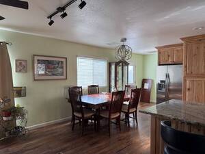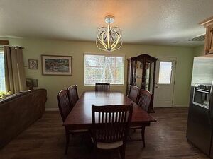 There are four doors leading to the new wood deck and back yard so navigating to and from the house is quite easy, great for when you have a large party. The granite breakfast bar can easily seat four or five people or sit at the oversized dining room table that’s included, no elbowing necessary.