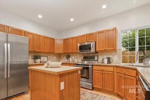 Welcome to this charming Lexington Hills home, tucked away on a quiet cul-de-sac with a darling front porch that invites you in. Inside, you’ll find three large bedrooms & two separate living spaces, offering plenty of room to spread out & enjoy. Thoughtful updates include new AC, interior paint, new fencing, & new flooring in the bathrooms & laundry room. The kitchen is beautifully designed with granite counters, an undermount single-basin sink overlooking the backyard, & a reverse osmosis system. Refreshed landscaping enhances the curb appeal & creates a welcoming outdoor retreat. The spacious primary suite is a true highlight, featuring an attached bonus room separated by a double-sided gas fireplace. Perfect as an office, workout space, or cozy sitting room, this versatile retreat adds so much. Lexington Hills offers fishing ponds & walking paths throughout. Backing up to Floating Feather where traffic is light & slow offers quick access to everything Eagle has to offer! This home offers an easy drive or walk to downtown Eagle, the bike park, and quick access to escape to the foothills or mountains for endless outdoor adventures.