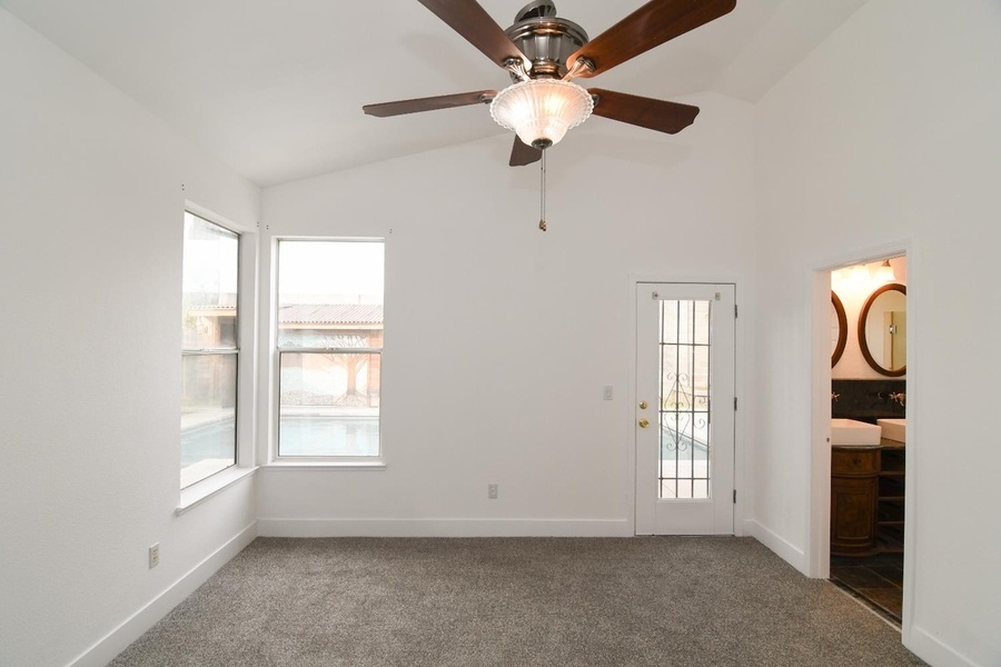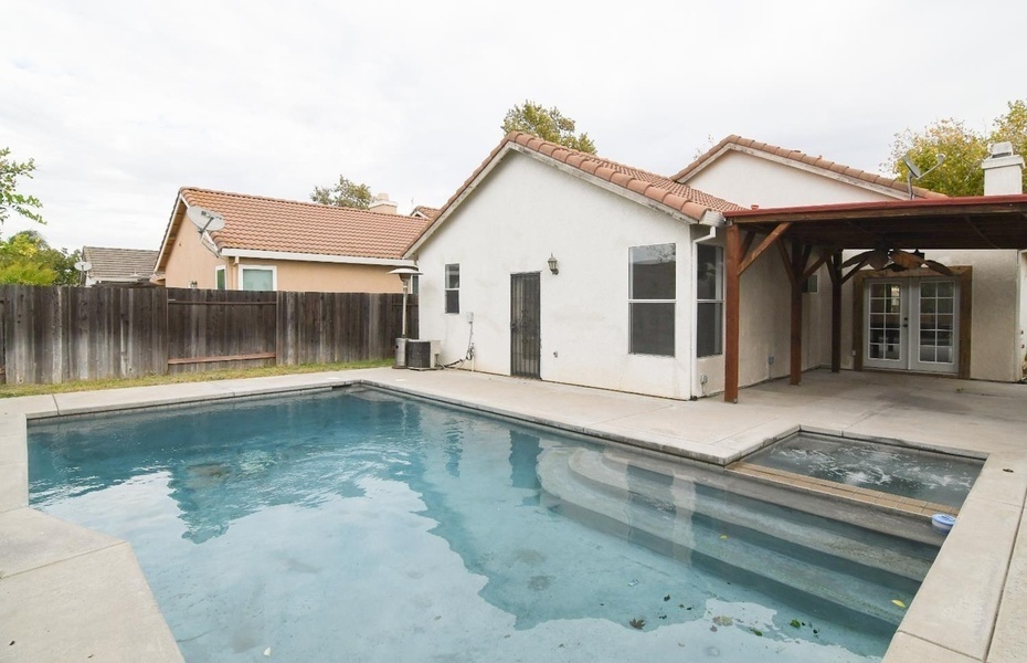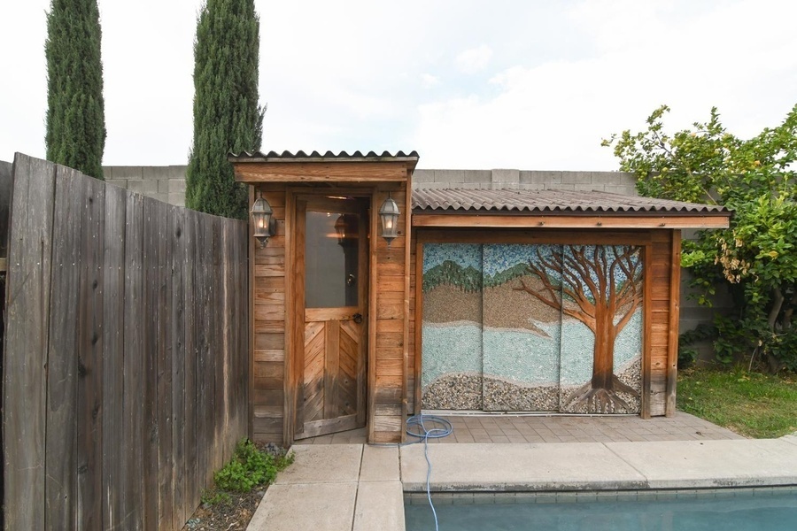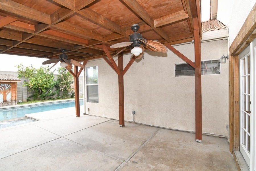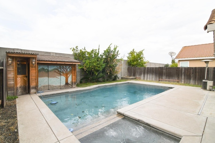 The spacious kitchen is ideal for those who love to cook and entertain, complete with stainless steel appliances and ample counter space. French doors lead to a backyard designed for relaxation and entertainment-featuring a covered patio, in-ground swimming pool, spa, and even a convenient poolside shower house.