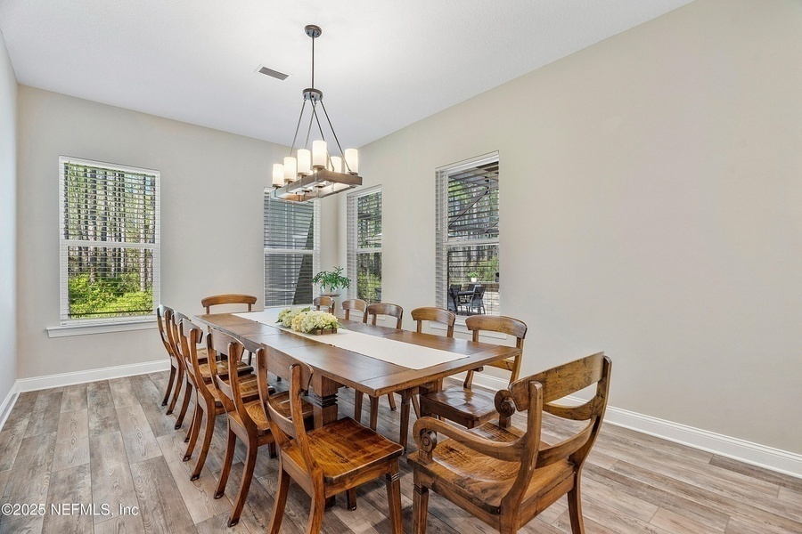 The three-car garage and extended driveway provide plenty of parking for guests, multi-generational households, or additional vehicles. Guests will immediately feel the warmth of their hosts as they drive up to the welcoming Trimlight Exterior lights.