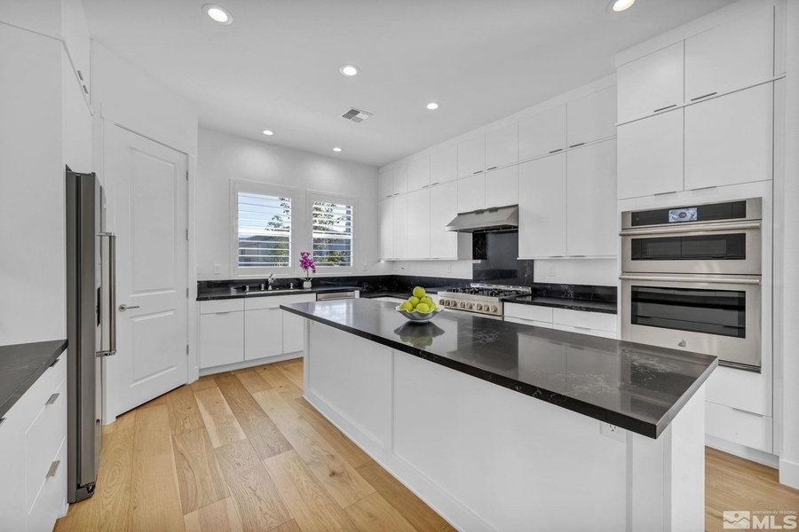 Inside, the open and airy great room boasts soaring ceilings, recessed lighting, and built-in credenzas, creating a sophisticated living space. This home is equipped with modern conveniences, including a Smart Home Security System, sound system with built-in speakers, and engineered hardwood flooring throughout. The chef-inspired kitchen features top-of-the-line JennAir appliances, a built-in oven and dishwasher, and a KitchenAid refrigerator that stays. A center island, pantry, and floor-to-ceiling cabinetry offer ample storage and prep space.