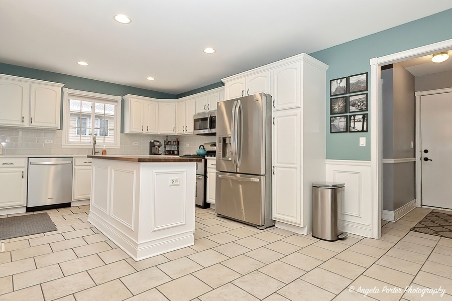 Simply Stunning, describes this breathtaking contemporary two-story home nestled on a generous 0.73 acres of serenity! Prepare to be captivated by the picturesque views and the unparalleled privacy provided by the lush woods that serve as your backdrop. As you step inside, you’ll immediately be enchanted by a unique floor plan that masterfully blends open concept living with delightful room divisions. The first space is incredibly versatile - use it as a dining room, a cozy living area, or a productive home office; the choice is yours! The recently remodeled kitchen is a dream, boasting a spacious butcher block island and ample room for a dining table, all while offering lovely views of your backyard oasis. The family room is a haven of comfort, featuring soaring vaulted ceilings and a stunning fireplace that invites warmth and relaxation.